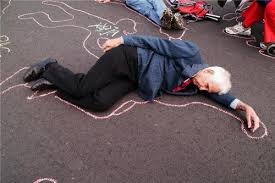in a die-in against nuclear weapons in front of the LLNL West Gate.